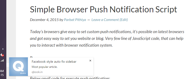 Today’s browsers give easy to set custom push notifications, it’s possible on latest browsers and got easy way to set you website or blog. Very few line of JavaScript code, that can help you to interact with browser notification system. Demo Click here to show push notification Below small code for execute push notification: <script language=”javascript”> showNotification(“Welcome […]